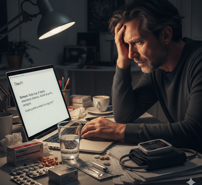 Con la diffusione capillare di internet e, più recentemente, degli strumenti di intelligenza artificiale, la tentazione di "cercare i propri sintomi online" è diventata irresistibile per molti. Un mal di testa diventa subito un tumore, un'eruzione cutanea una malattia rara, e così via. L'intelligenza artificiale, pur essendo uno strumento potentissimo, non può sostituire la valutazione clinica di un professionista sanitario che considera la storia del paziente, esegue esami obiettivi e richiede accertamenti mirati quando necessario.